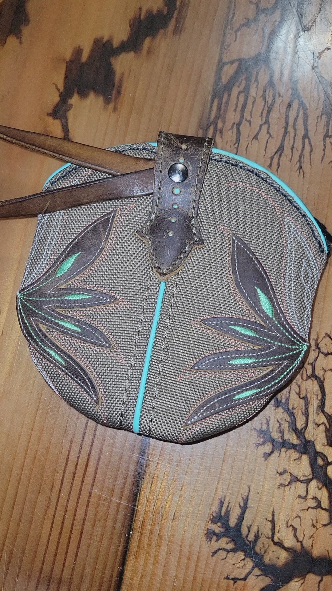 Up-cycled Cowgirl boot. Small wristlet made from the top of a cowgirl boot. Zipper closure and leather wrist strap. Canvas material with leather accents and embroidery.