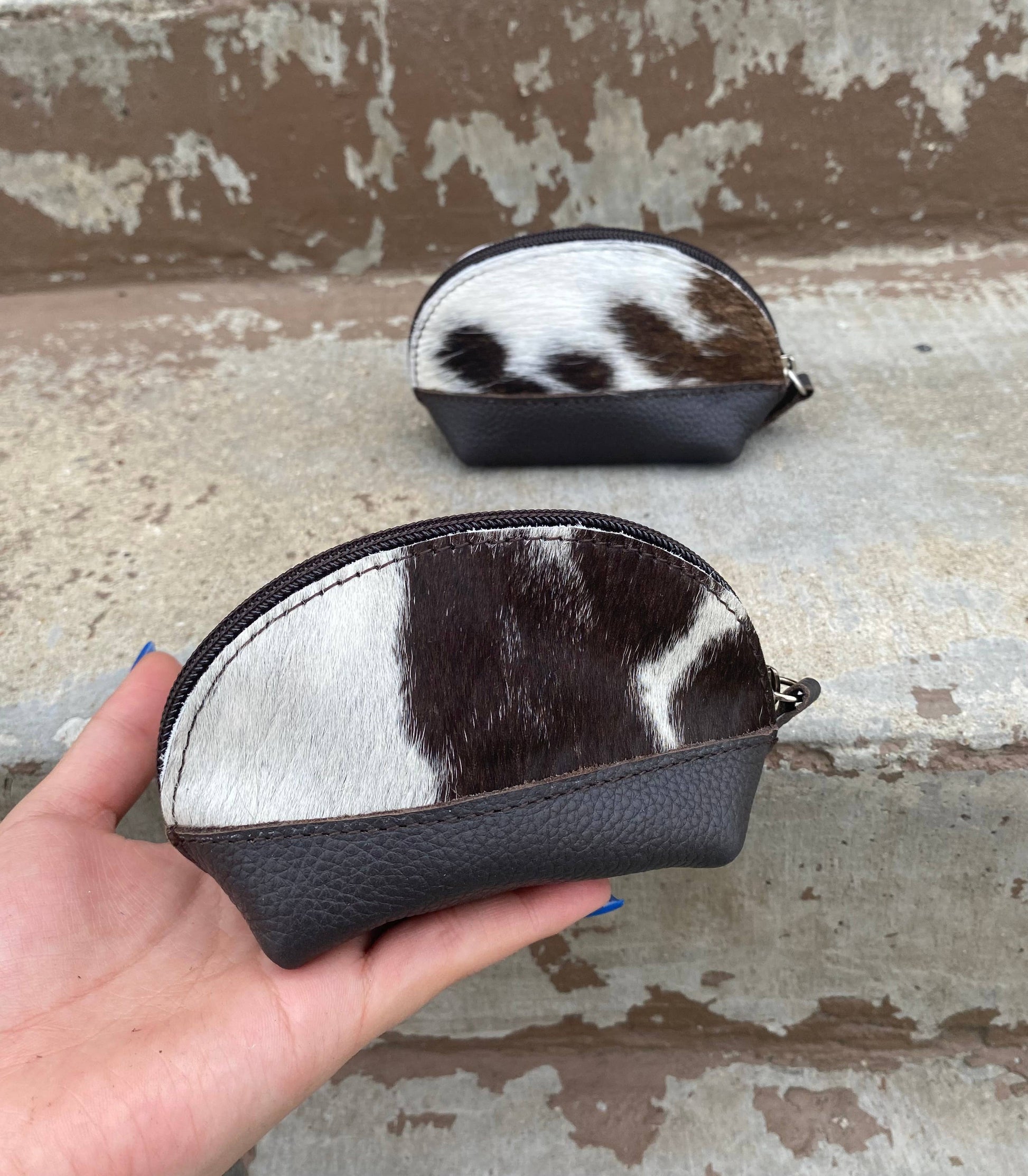 Cowhide coin pouch! Full hair on hide front and back! Great for holding small items like coins, cards and much more! Each coin bag is unique and one of a kind. measures: 5”x3”