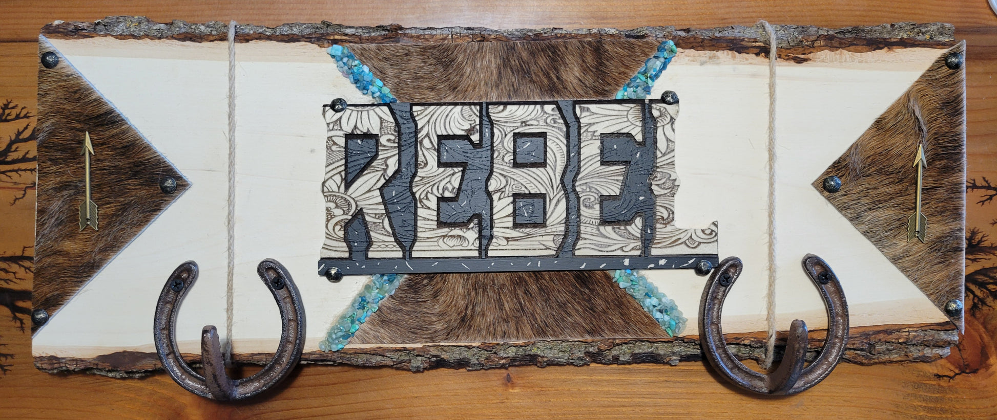 Take your tack room décor to the next level with our daring and bold Custom Name Signs! Each one is uniquely handcrafted, laser engraved, and adorned with real cow hair on hide and stones. Keep your halters, lead ropes, and more organized with these functional pieces. Plus, a clear seal provides protection against all types of weather. Embrace the adventure and add a touch of risk to your space. Saddle Vixens will contact you to discuss your sign design once purchased.