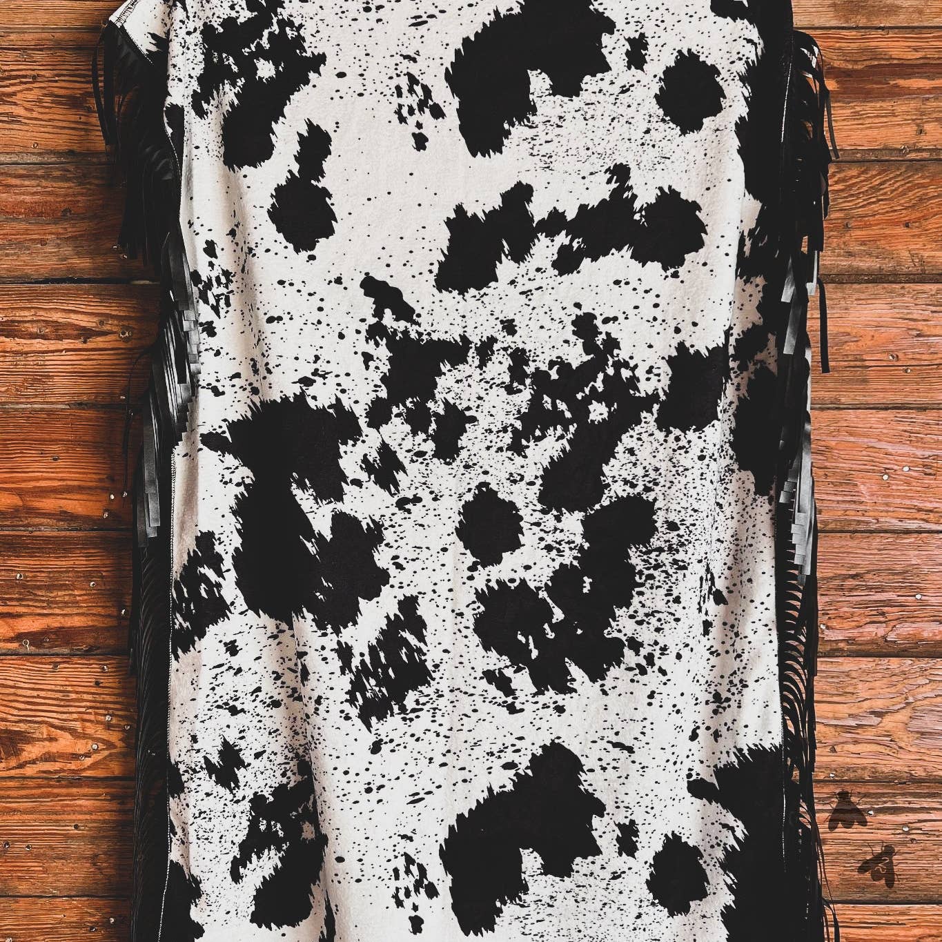 BLACK & WHITE salt n pepper cowhide FLIP CLASSIC AZTEC BOLD PRINT with FRINGE. DIMENSIONS: 43" x 29"
